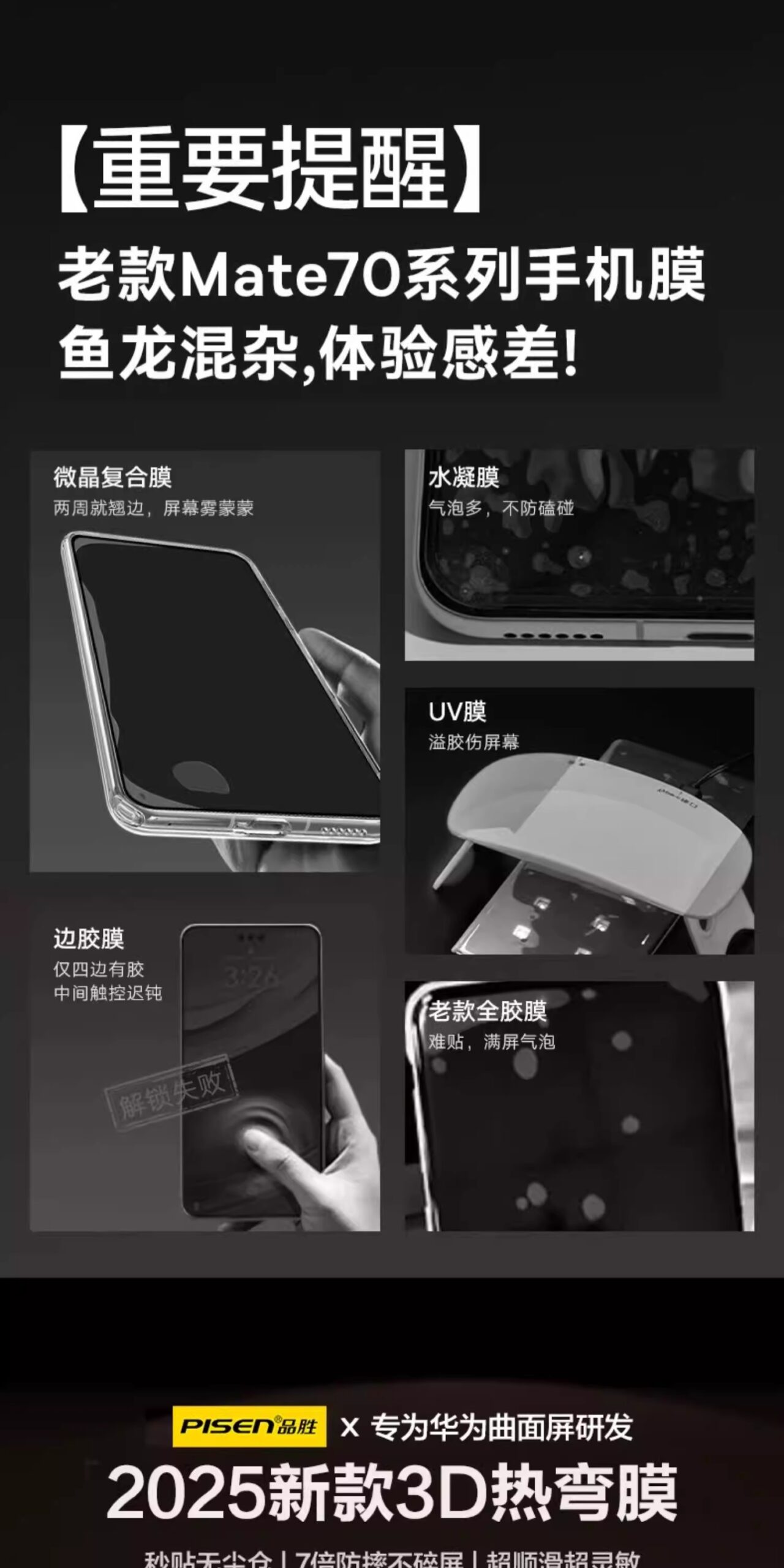 品胜3D热弯膜适用华为Mate80promax钢化膜70/60Pro新款pura80pro手机膜70全胶护60贴膜50无尘仓防摔非凡大师